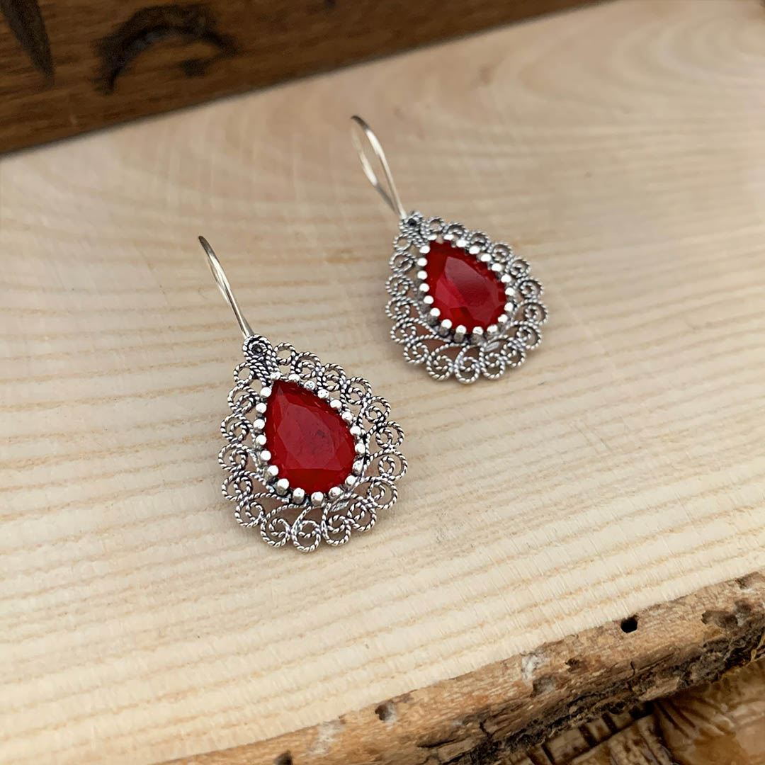 Yakut Taşlı Damla Tasarım Telkari Gümüş Bayan Küpe
